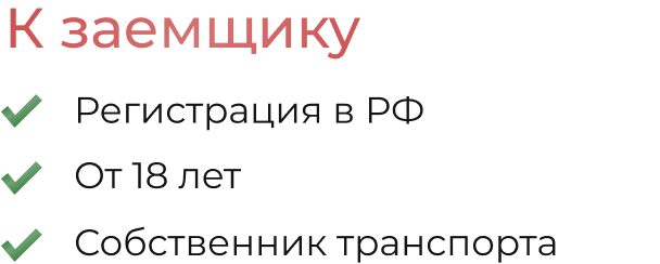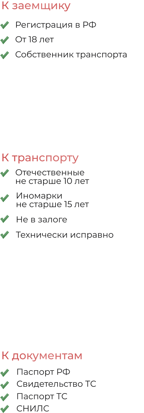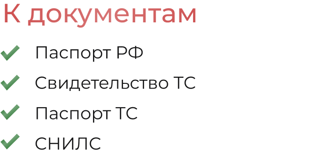 Для физических лиц: • Наличие транспортного средства • Паспорт гражданина РФ • Страховое свидетельство СНИЛС • Действующий паспорт на транспортное средство (ПТС) • Свидетельство о регистрации ТС (СТС)
