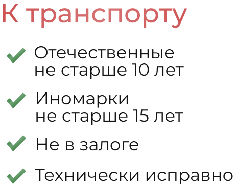 Для юридических лиц: • Наличие транспортного средства • Уставные документы юр. лица • Документы, подтверждающие право собственности на ТС